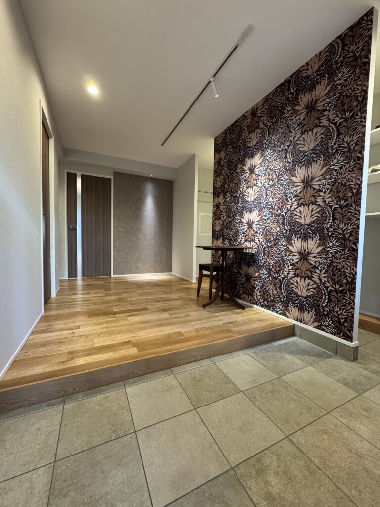 玄関扉を開けると、広いホールとモダンなアクセントクロスがお出迎えします。